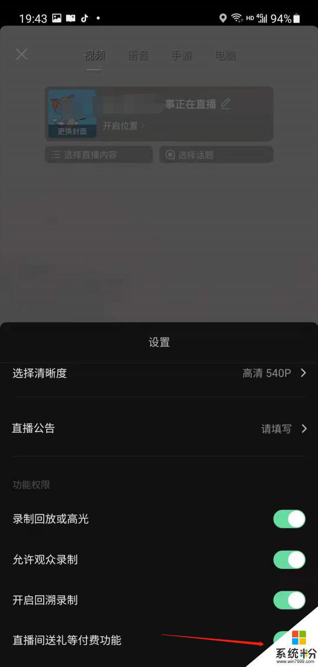 4.在设置界面,点击关闭“直播间送礼等付费功能”,然后返回开始视频直播,就关闭了抖音直播送抖币功能。